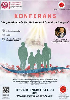 Köse İlçe Müftülüğünce 2025 Yılı Mevlid-i Nebi Haftası münasebetiyle 01 Ekim Çarşamba günü saat 14:00'da Gümüşhane Üniversitesi İrfan Can Köse Meslek Yüksekokulu'nda düzenlenecek olan, Gümüşhane İl Müftümüz Sayın Dr. Hayri ERENAY Hocamızın konuşmacı olarak katılacağı "Peygamberimiz Hz. Muhammed Aleyhisselam ve Gençler" konulu konferansa üniversitemizde okuyan tüm öğrencilerimiz davetlidir.